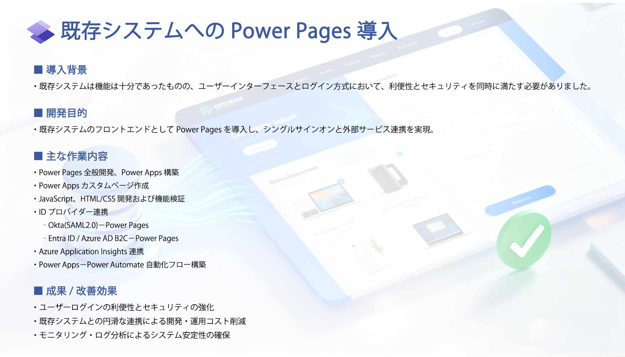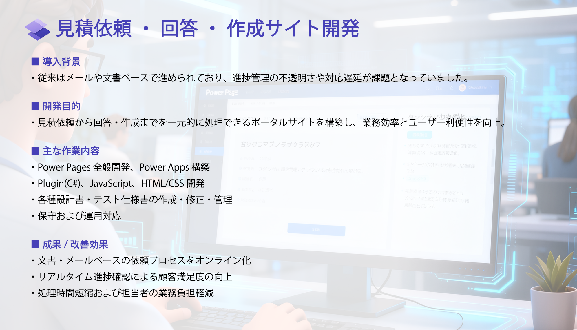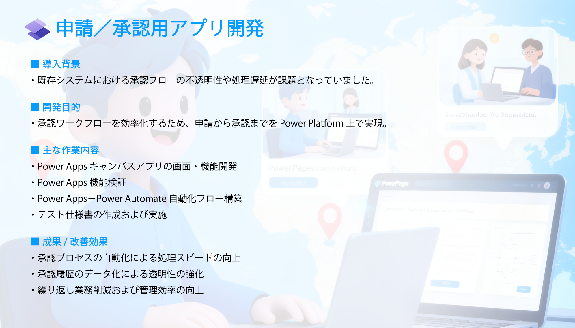 私たちと共に最新技術を駆使して多彩な未来を描く熱意があるSE、PGを募集しています。システム開発やものづくりを通じ社会貢献と自己実現を目指し、あなたの力を試してみませんか! ご質問等は下記応募連絡先までお問い合わせください。 応募資格 *マイクロソフト製品知識に興味がある、もしくは知識をお持ちの方 Dynamics365、Office365、Sharepoint、Power BI、Cognitive Service、.Net言語等 *ほかには下記の開発言語の経験をお持ちの方 Java、Node.js、Angular/AngularJS、Android/iOS、Python、HTML5